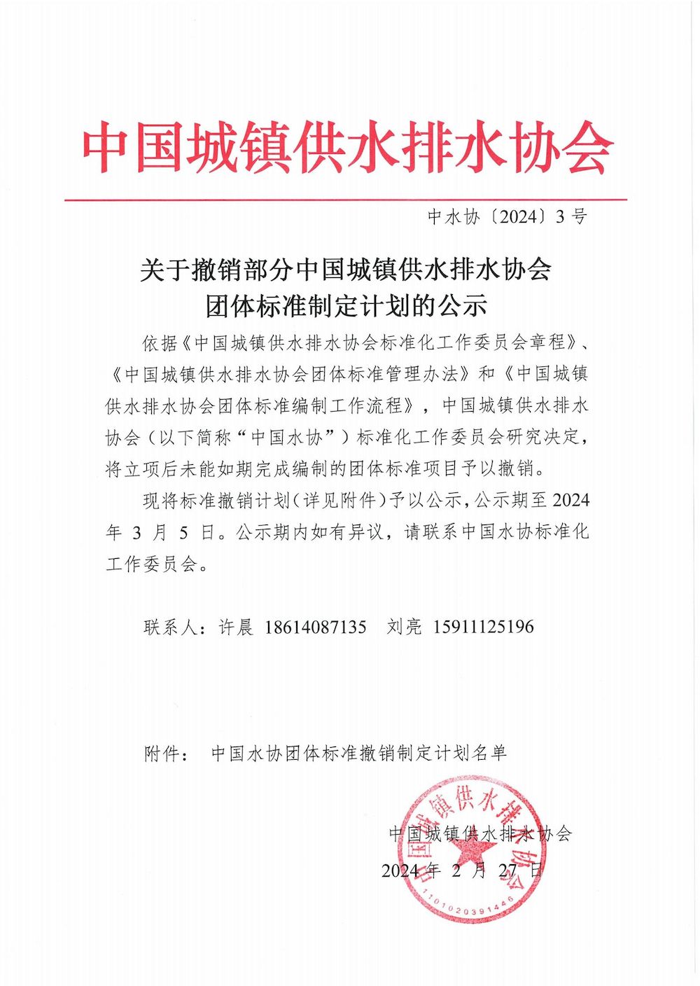 公示 | 关于撤销部分中国城镇供水排水协会团体标准制定计划的公示